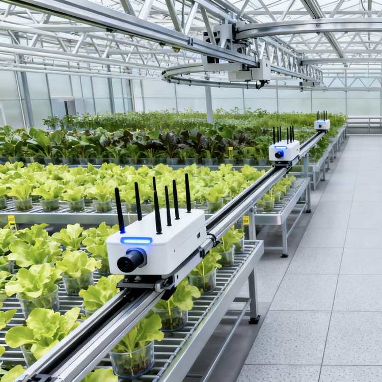 溫室巡軌式表型采集分析系統(tǒng)以巡檢機(jī)器人與專業(yè)可見(jiàn)光成像單元為核心,專為植物生長(zhǎng)動(dòng)態(tài)監(jiān)測(cè)與基礎(chǔ)表型分析設(shè)計(jì)。吊軌軌道可實(shí)現(xiàn)對(duì)目標(biāo)種植區(qū)域的穩(wěn)定覆蓋與靈活移動(dòng),確保成像單元能精準(zhǔn)抵達(dá)不同監(jiān)測(cè)點(diǎn)位,可見(jiàn)光成像單元通過(guò)高清圖像采集,可捕捉植物在生長(zhǎng)周期中的形態(tài)變化與顏色特征,為后續(xù)表型分析提供基礎(chǔ)數(shù)據(jù)支撐。