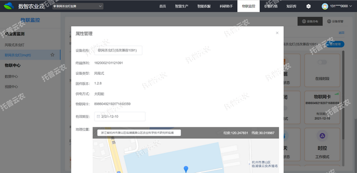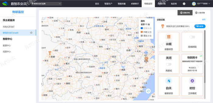 4、風(fēng)吸式茶園殺蟲(chóng)燈支持手機(jī)App與Web端控制,具有豐富的狀態(tài)信息展示,足不出戶就可以了解一切,如地理位置、設(shè)備編號(hào)、基地名稱、物聯(lián)網(wǎng)卡卡號(hào)、剩余流量、卡有效期、GSM天線連接是否正常等故障報(bào)警信息??蛇h(yuǎn)程控制、查看設(shè)備的當(dāng)前工作狀態(tài)、信號(hào)強(qiáng)度、電量使用等情況。